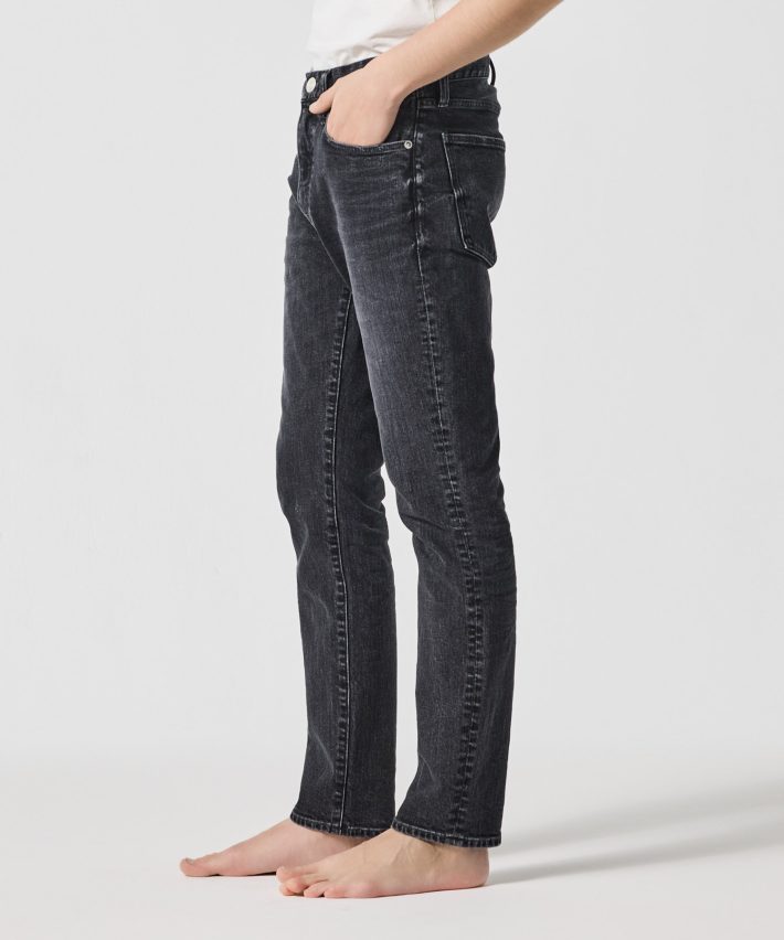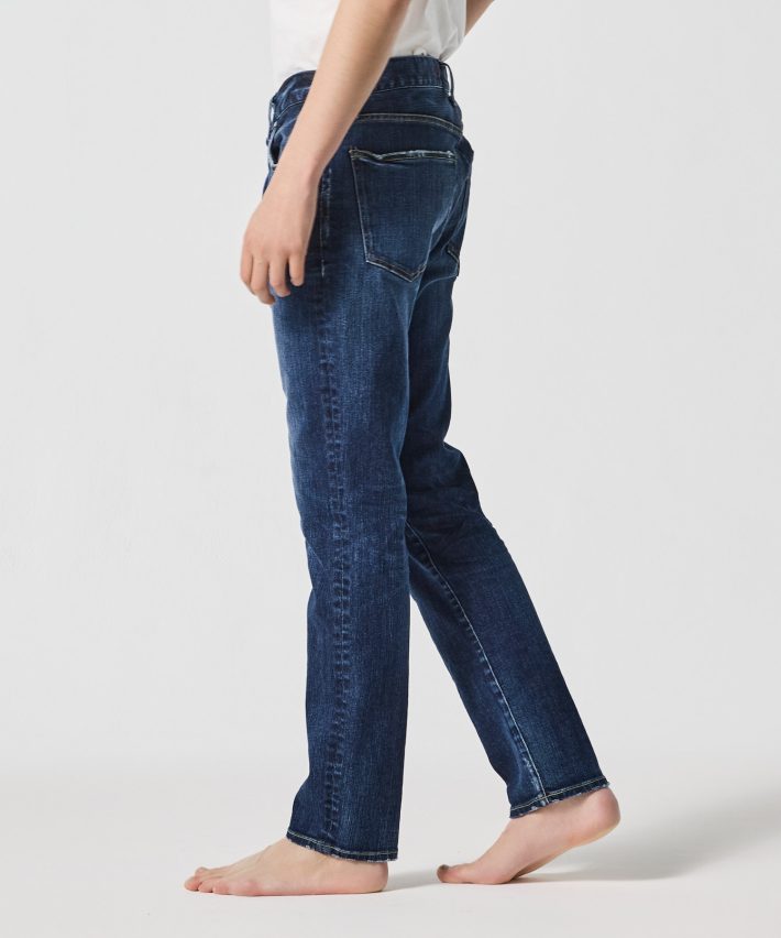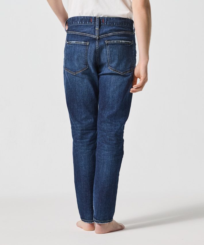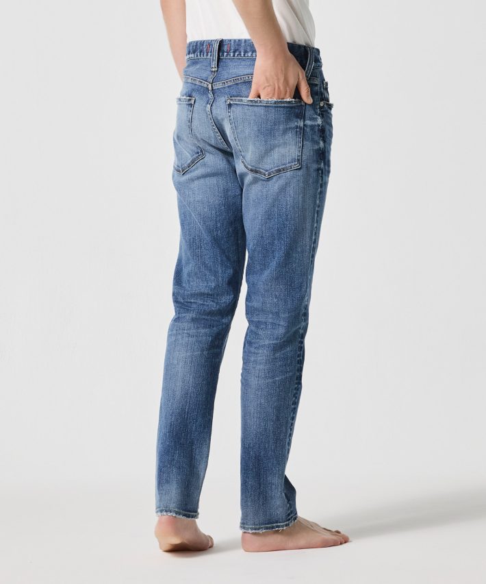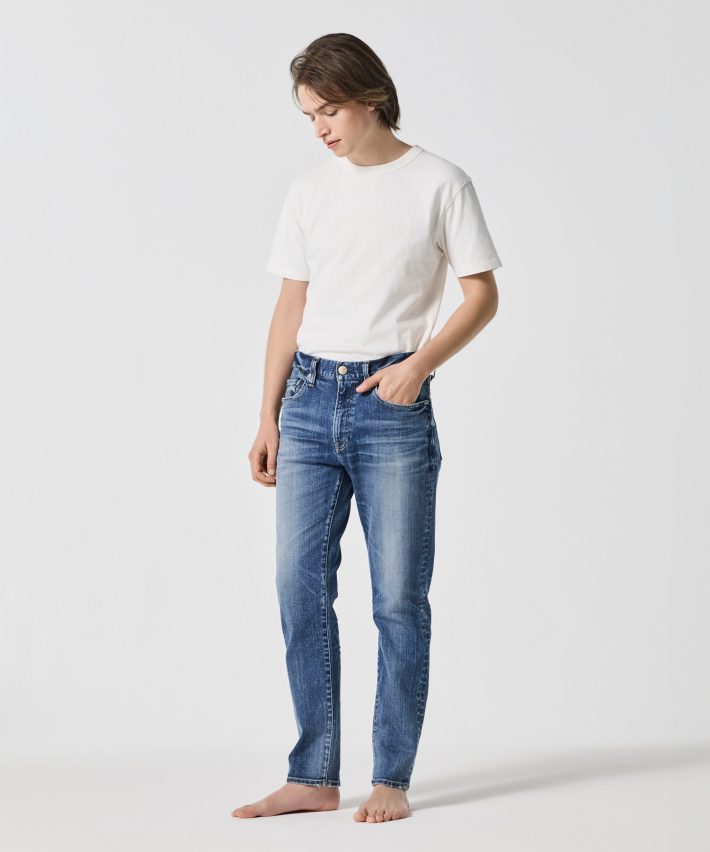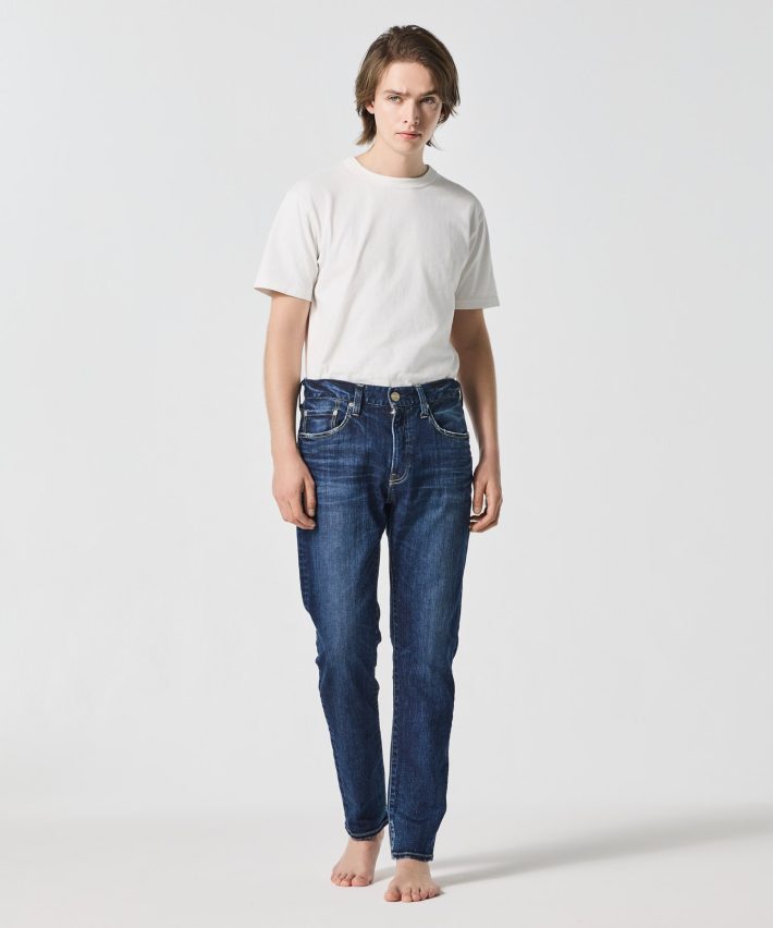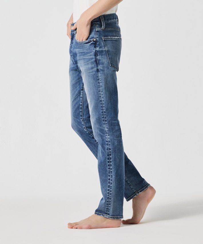 インディゴは2色展開。カイハラの3者混ハイパワーストレッチデニム地採用。従来のポリウレタンストレッチより伸縮性も大幅にUP。縦目がしっかりと見える生地で、縦のラインが美しく、淡いカラーでも足を細く見せてくれます。加工感はリアルヴィンテージのような絶妙な色でレディースにはない立体ヒゲを入れています。