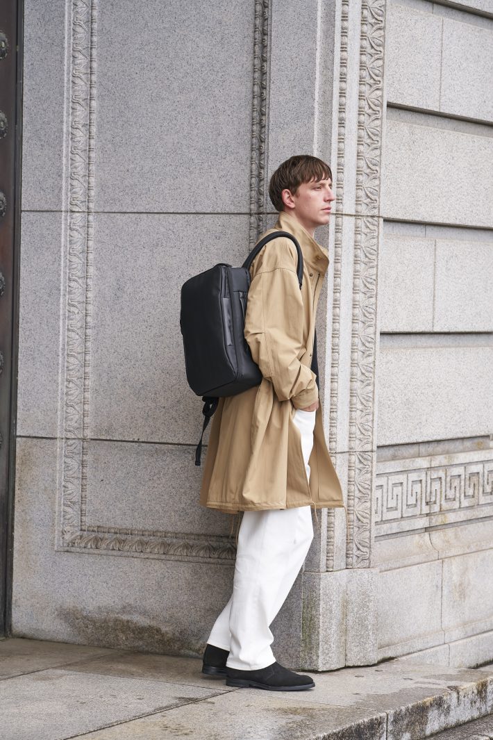 本体にはポリエステルにPVC加工を施した、雨や汚れに強い生地を採用。ON/OFFの様々なシーンに対応する実用性とデザイン性を兼ね備えています。