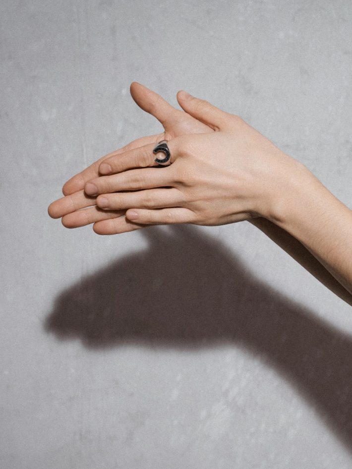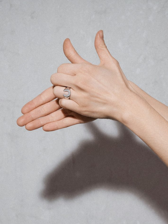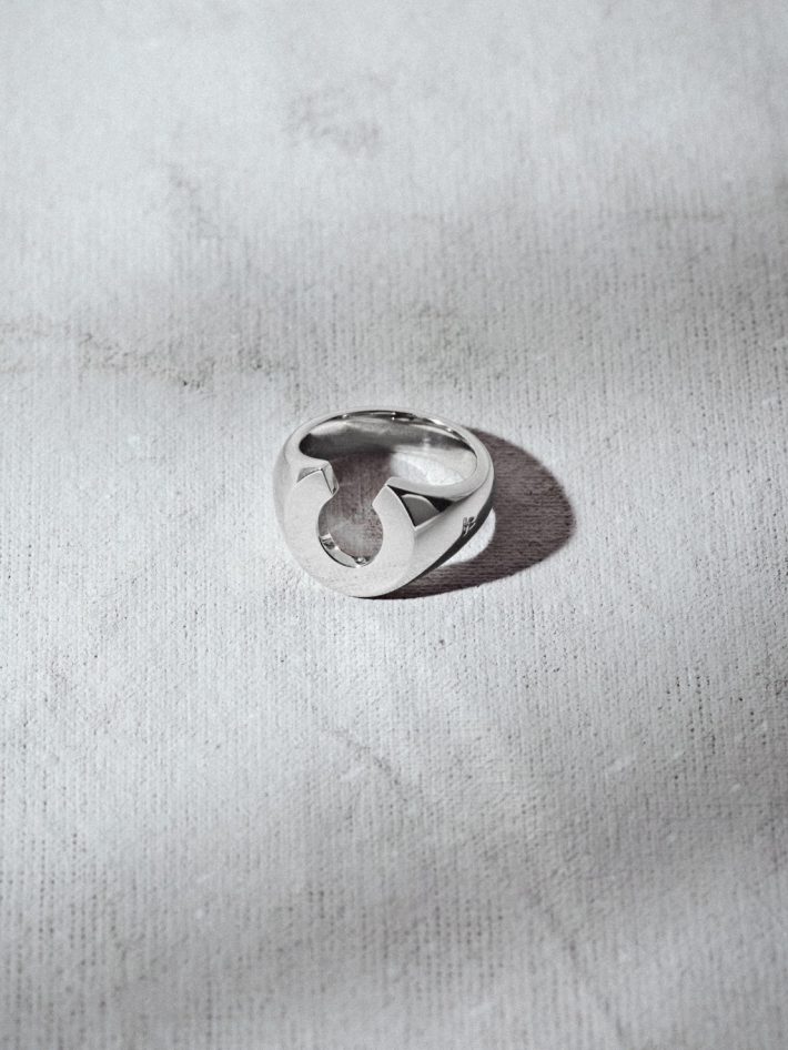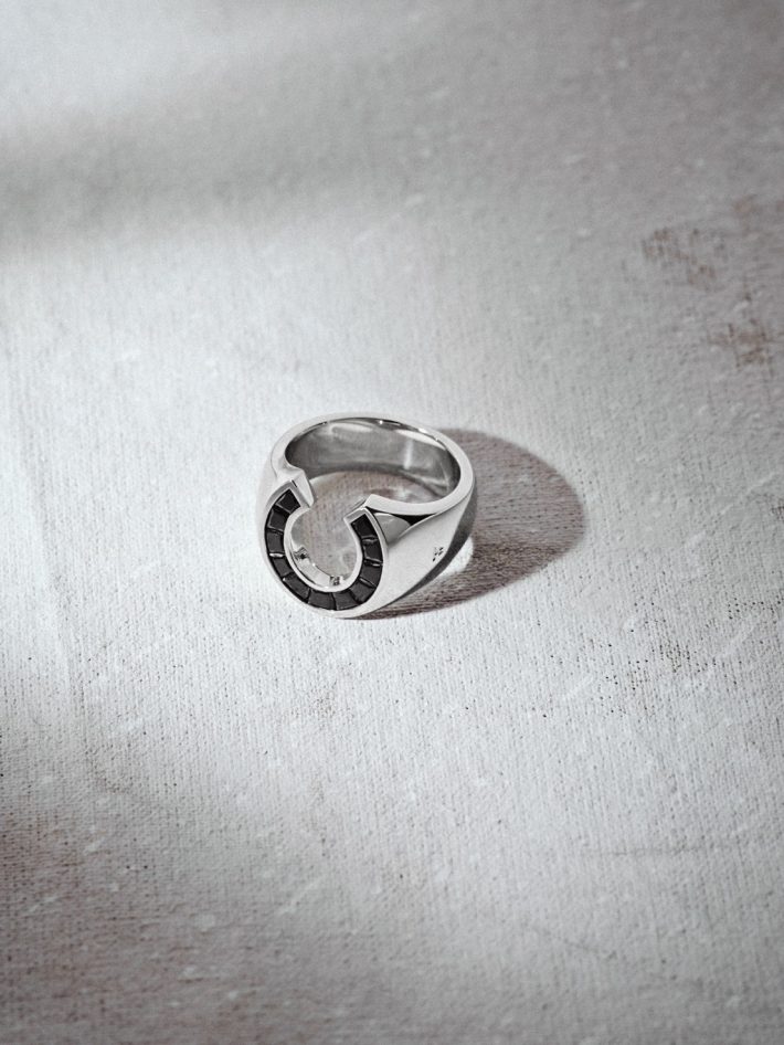 幸運を呼ぶモチーフとして古くから愛されてきた"馬蹄"を象ったデザイン。素材にはサステナブルな再生925シルバーを使用し、ホワイトロジウムで仕上げることで、より品格ある輝きを実現しています。ブラックスピネルモデルは、ブラックスピネル本体に特殊なカットが施され、職人の手によって一ピースずつすべて手作業で丁寧にセッティングされています。