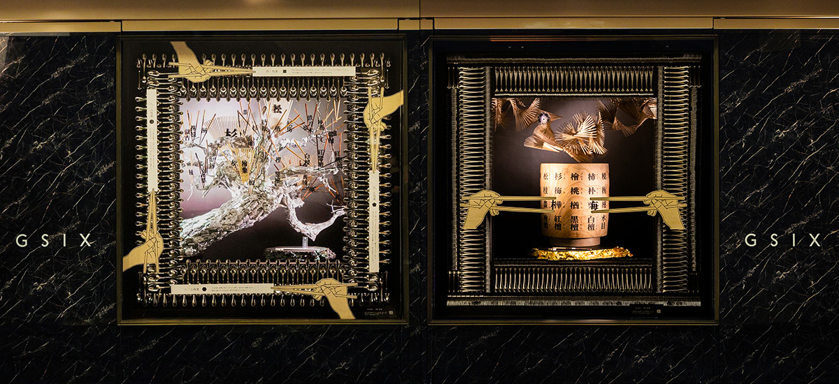 本ウィンドウでは、多彩な樹種を盆栽のように仕立てたオブジェと、木偏の漢字をあしらった大きな湯呑みから立ち上がる箸の彫刻によって、四季の表情豊かな森と食卓がひとつにつながる感覚を表現しました。
