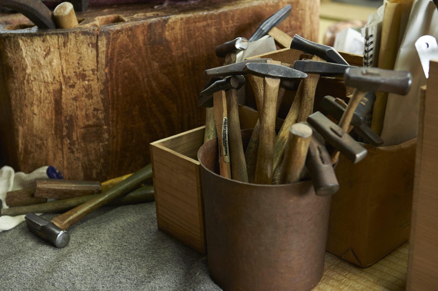 ひと打ちごとに刻まれた鎚目は、光をやわらかにうつし、その輝きに深みを与えます。ひとつひとつ、表情はわずかに異なり、同じものはありません。手に取り、使うほどに、その輝きは自然と愛おしく感じられてきます。使い込むほどに色は落ち着き、お茶の時間に寄り添っていきます。